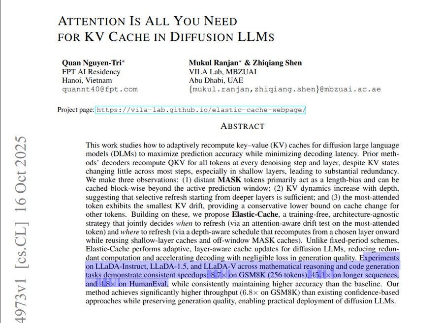 This paper speeds up diffusion LLM decoding by updating the stored keys and values cache only when and where needed. Reported gains reach up to 45.1x in the longest cases.