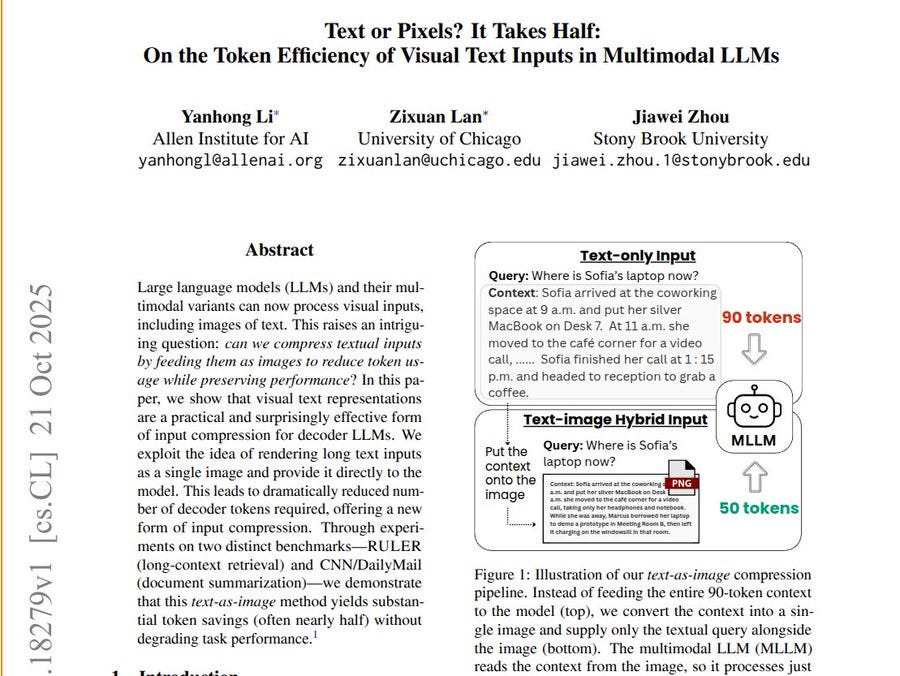 LLMs spend most time and money in the decoder, so cutting decoder tokens cuts cost and latency. The paper shows a simple way to cut LLM tokens by turning long text into one image while keeping accuracy.
