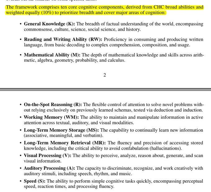 They ground the checklist in the Cattell Horn Carroll model, a long standing map of human cognitive abilities. The 10 areas cover knowledge, reading and writing, math, on the spot reasoning, working memory, long term memory storage, long term memory retrieval, visual processing, auditory processing, and speed.