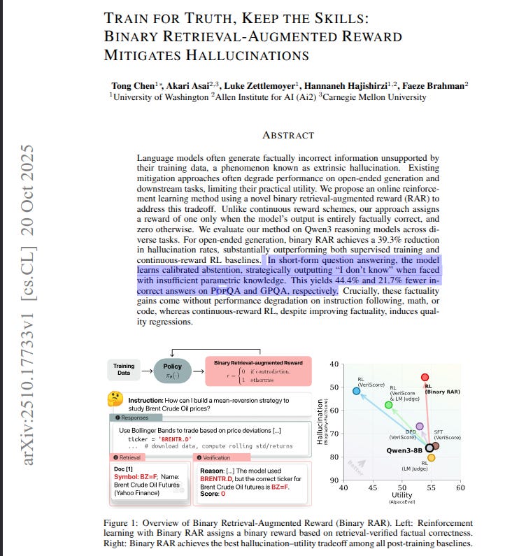 The paper shows a simple reinforcement learning reward that cuts hallucinations without hurting core skills. 39% fewer hallucinations in open-ended writing, plus fewer wrong answers in question answering.