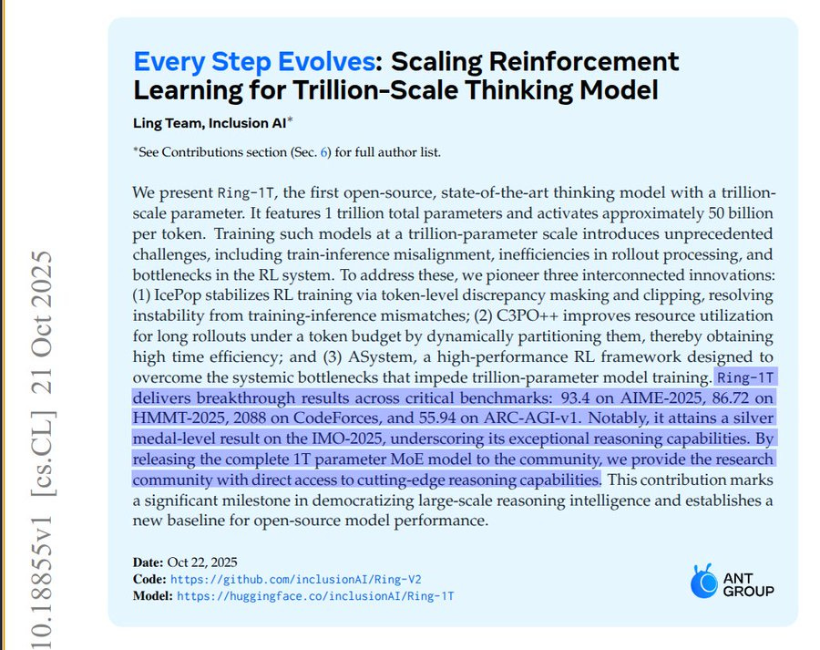 They built Ring-1T, a 1 trillion parameter Mixture-of-Experts model. Out of total 1T parameters, activates 50B per token, and reached an IMO 2025 silver level.