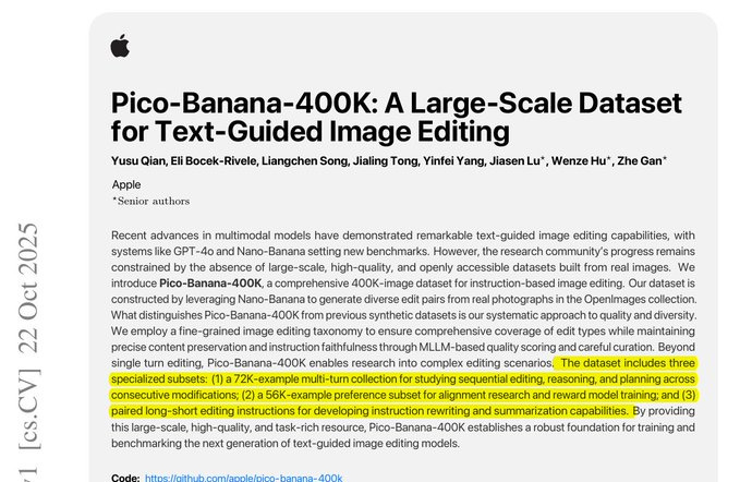 Apple dropped Pico-Banana-400K. A huge ~400K text-guided image editing dataset from real OpenImages photos with 35 edit types, automated Gemini-judged quality, and open sharing for research.