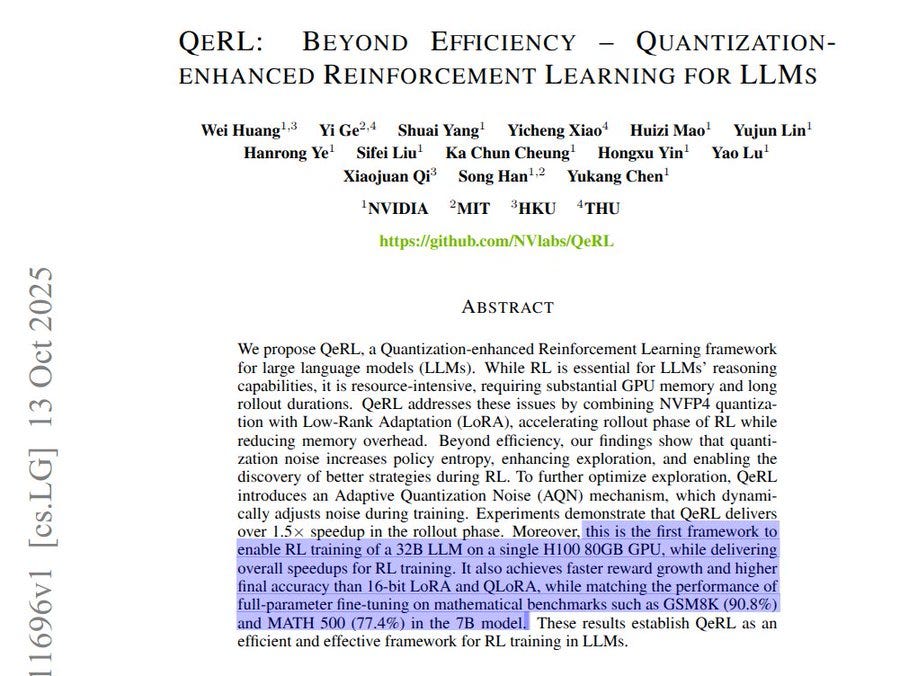QeRL (Quantization-enhanced Reinforcement Learning) trains LLMs with RL using 4-bit weights and tuned noise, boosting speed and accuracy.