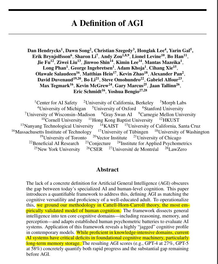 They emphasize that both GPT-4 and GPT-5 fail to form lasting memories across sessions and still mix in wrong facts when retrieving, which limits dependable learning and personalization over days or weeks. The scope is cognitive ability, not motor control or economic output, so a high score does not guarantee business value.