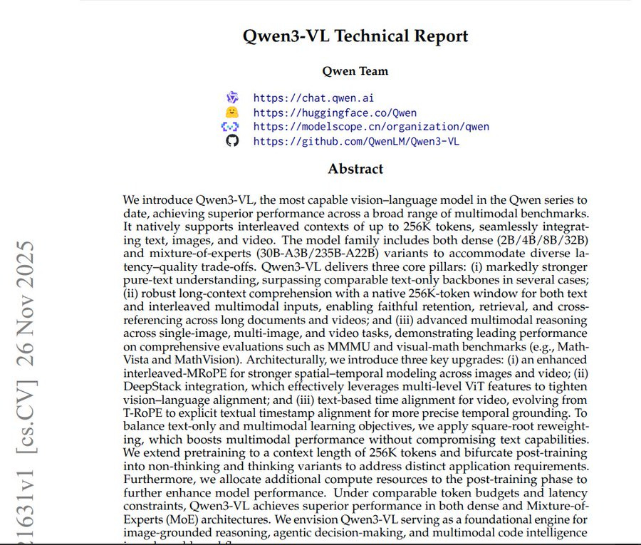 Can handle very long mixes of text, images, and video without its thinking falling apart. First, they train it from the start to work with a native context of 256K tokens, and they gradually scale sequence length and data so the model actually learns to keep track of information scattered across many pages or minutes of video instead of forgetting early parts. Second, they change how positions in space and time are encoded with interleaved MRoPE, which basically means every visual token carries a well balanced tag of “where in the frame” and “when in the video”, so the model does not get confused about ordering when clips are long.