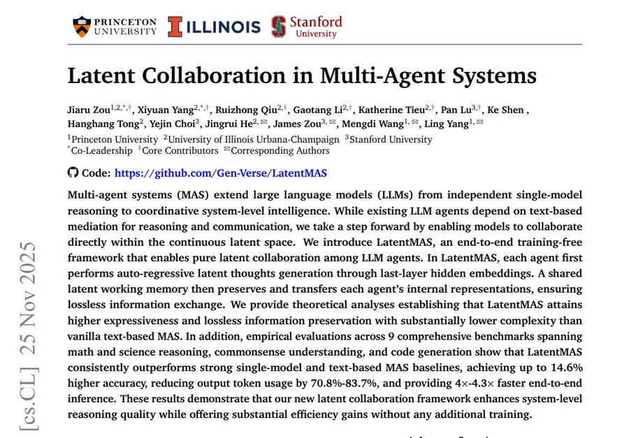 New Stanford + Princeton + Illinois Univ paper shows language model agents can collaborate through hidden vectors instead of text, giving better answers with less compute. In benchmarks they reach around 4x faster inference with roughly 70% to 80% fewer output tokens than strong text systems.