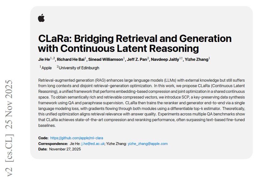 🗞️ CLaRa: Bridging Retrieval and Generation with Continuous Latent Reasoning