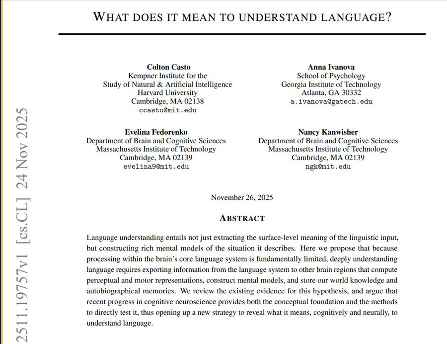 New Harvard+MIT+Georgia Tech paper argues that truly understanding language means linking words to rich nonverbal brain systems that model reality. First, it explains that the brain’s language regions mostly track patterns in words and grammar, similar to phone typing suggestions.