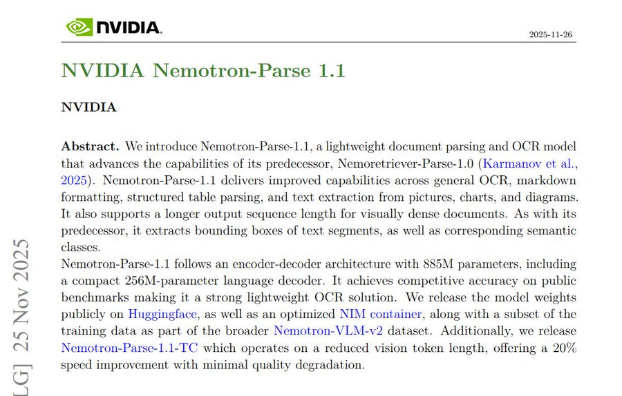 Paper behind NVIDIA Nemotron Parse 1.1, a super-lightweight document parsing and OCR model. Its compressed version runs about 20% faster than the full one while keeping almost the same quality.