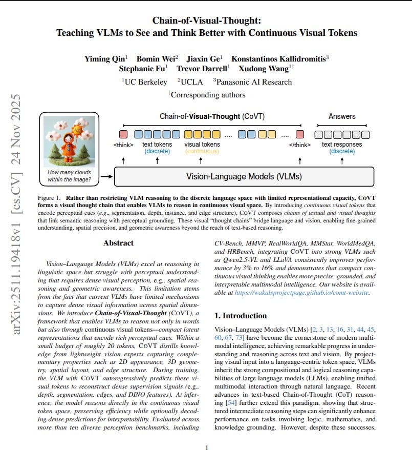 Chain of Visual Thought adds continuous visual tokens into the reasoning, where small sets of tokens summarize segmentation masks that mark objects, depth maps that show distance, edge maps that show boundaries, and patch features that store higher level meaning, all learned from lightweight teacher networks. During training, a 4 stage curriculum teaches the model to output visual tokens, use them inside a think block before the answer, and still work when some token types are randomly dropped. At test time it predicts a short chain of visual tokens plus text, can optionally decode the tokens into human viewable masks or depth maps, and in models like Qwen2.5 VL this gives around 3% to 16% better scores on many vision heavy benchmarks without hurting general language ability.