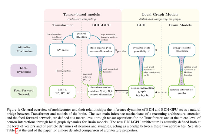 How ‘Dragon Hatchling’ (BDH) and its GPU version connect Transformers to brain-style graph models. It highlights 2 key mechanisms, attention and a feed forward network, and shows their tensor version on the left and their neuron graph version on the right.