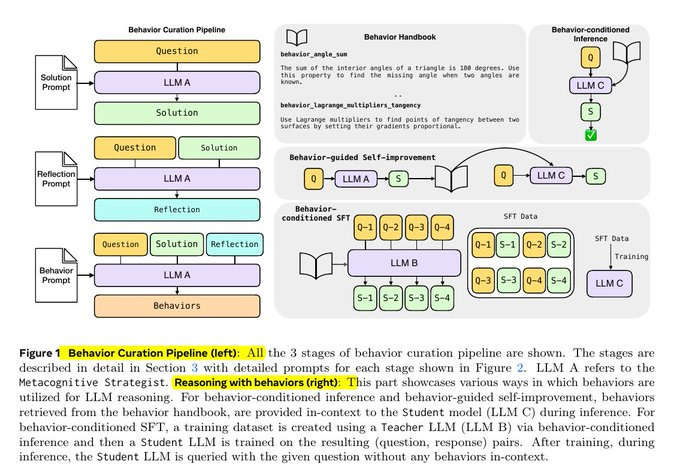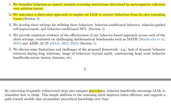 So this paper teaches the model to compress those recurring steps into small named behaviors that it can recall later or even learn into its weights. A behavior compresses that routine into a short name plus instruction like a tiny macro that the model can reference.