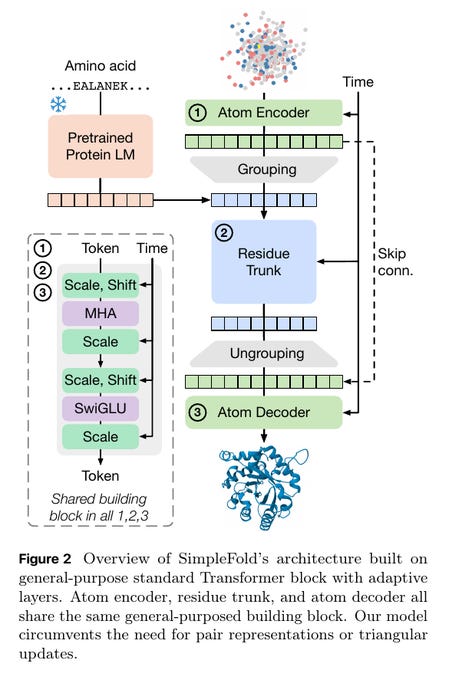 At each time step it also takes a noisy 3D cloud of atoms and encodes them in an Atom Encoder. It groups atoms into 1 token per residue and runs them through a Residue Trunk made of the same simple transformer block.