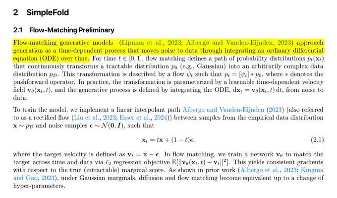 The crucial technique they used to get such great result is “flow matching,” which teaches the model how to move a noisy 3D protein toward its true shape using many tiny steps. During training they take a real protein, scramble the atom positions with noise, and ask the transformer to predict the small motion each atom should take at a given time to get closer to the real structure.