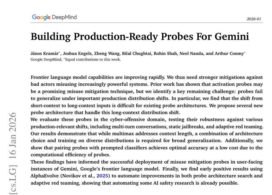 A probe is a tiny classifier that reads a model’s hidden signals to flag risky prompts, and it already informs Gemini deployments. They found using probes across traffic can be over 10,000x cheaper than running an LLM monitor on every request with similar accuracy.