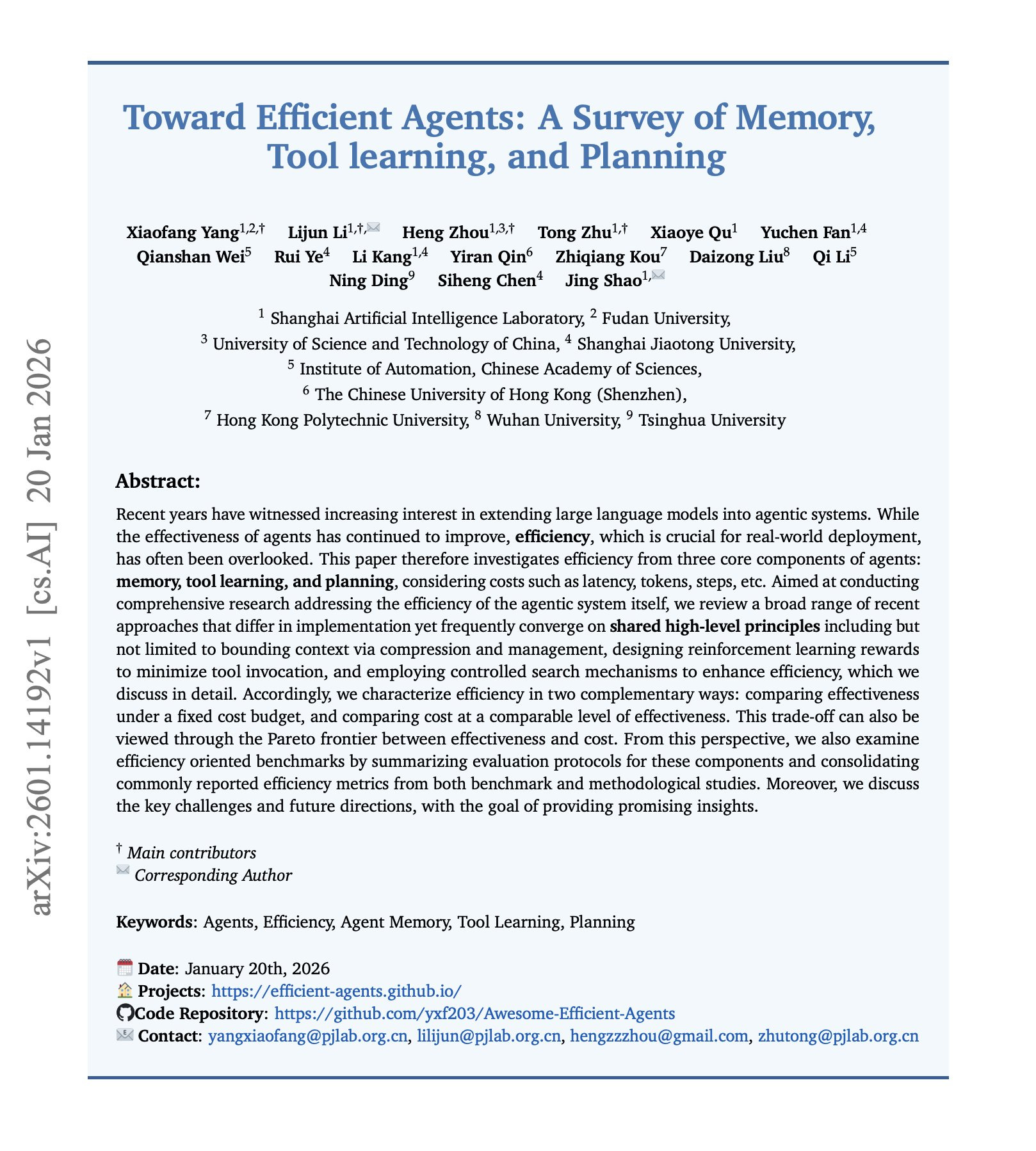 It breaks agent efficiency into memory, tool learning, and planning, and ties each one to measurable costs like latency, tokens, and steps. The main result is a set of shared design principles and a cost-aware evaluation framing, rather than a new state of the art score.