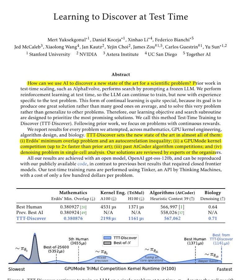 Solid roundup on the paper front! The TTT-Discover framework is especially intresting—training at test-time while the model's actually solving the problem feels like a natural next step beyond just scaling up sampling. I've been following test-time compute research and its wild how much gain you can get from adaptive learning vs brute-force guessing. The productionprobing work from DeepMind also shows we're finally getting practical safety tooling that doesn't kill latency.
