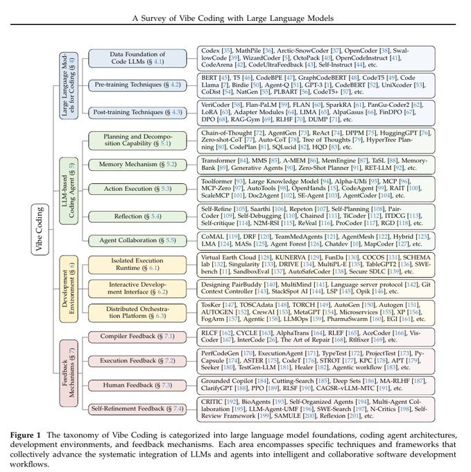 The taxonomy of Vibe Coding is categorized into large language model foundations, coding agent architectures, development environments, and feedback mechanisms.