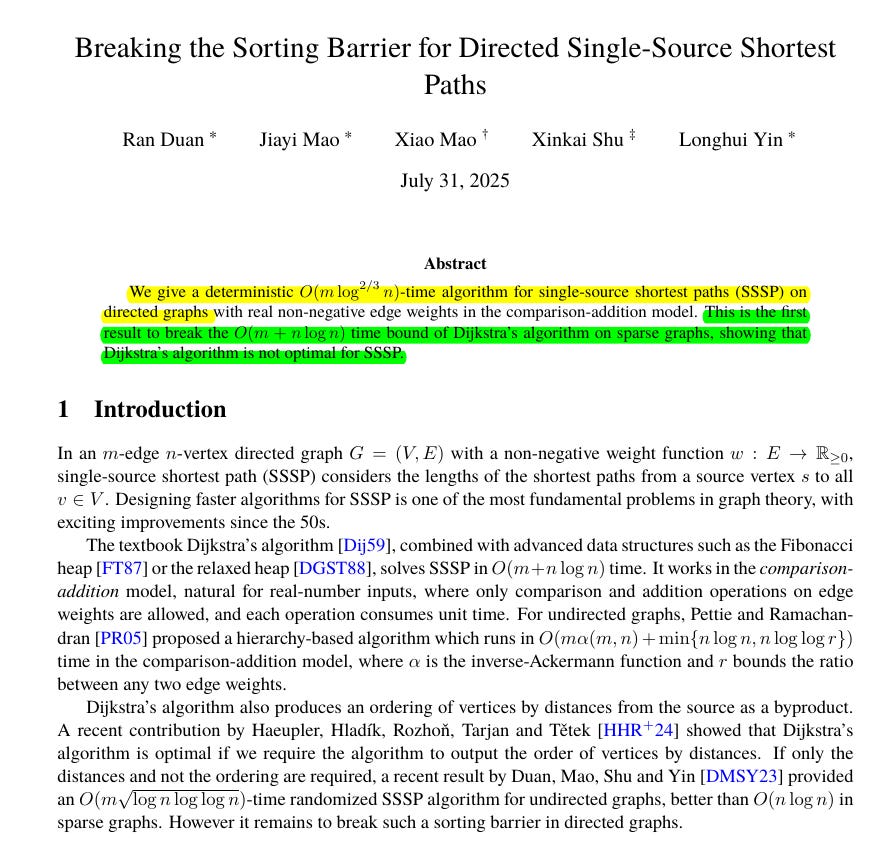 Researchers just showed a deterministic O(m log^(2/3) n) single‑source shortest‑paths algorithm for directed graphs with non‑negative weights that is provably faster than Dijkstra on sparse graphs, which breaks the sorting barrier