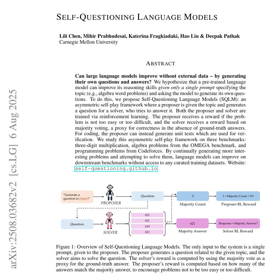 🧠 Why this works: The key is curriculum from interaction, not a fixed dataset. Curriculum is just the sequence of training problems the model sees, with difficulty that keeps adjusting to the model’s current skill. The paper calls the setup self-questioning, where the same base model plays proposer and solver using reinforcement learning, so the data gets shaped by performance rather than a fixed dataset