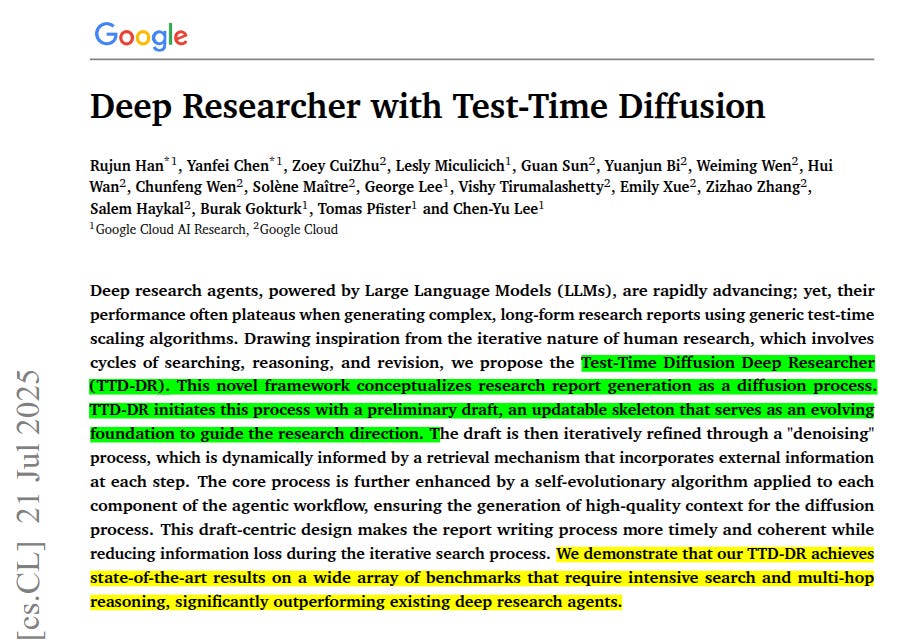 TTD‑DR starts with a quick rough draft drawn from the model’s own memory. That draft and a simple outline steer the next search query, the browser grabs documents, a RAG module writes a tidy answer, and the draft gets patched. The patched draft then triggers the next question, creating a self‑correcting cycle that echoes how humans jot, look things up, and revise.
