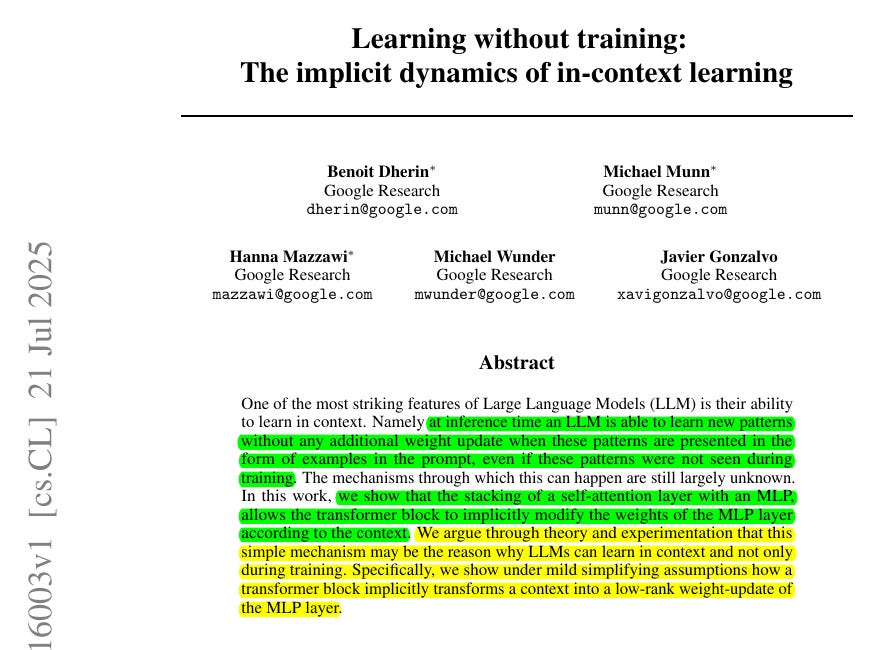 A beautiful GoogleResearch paper explains how LLMs can learn in context from examples in the prompt, can pick up new patterns while answering, yet their stored weights never change.