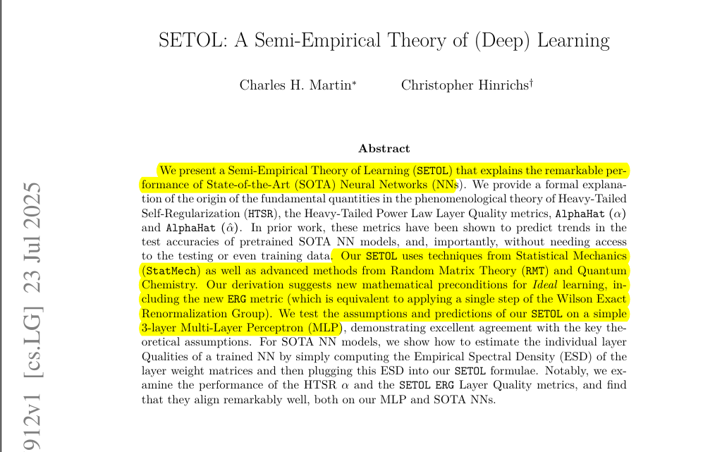 SETOL (Semi-Empirical Theory of Learning) is a theory of NN layer convergence. It argues that the individual layers of NN converge at different rates, and the 'Ideal' state of convergence can be detected simply by looking at the spectral properties of the layer weight matrices.