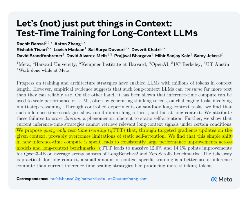New Meta paper shows long context large language models miss buried facts, and fixes it with query-only test-time training (qTTT). On LongBench-v2 and ZeroScrolls, it lifts Qwen3-4B by 12.6 and 14.1 points on average.