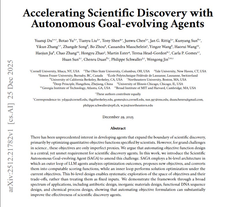 SAGA is a system where an LLM keeps rewriting the score function during a scientific search, so the search stops chasing fake wins. The big deal is that most “AI for discovery” work assumes humans can write the right objective up front, but in real science that objective is usually a shaky proxy, so optimizers learn to game it and return junk that looks good on the proxy.