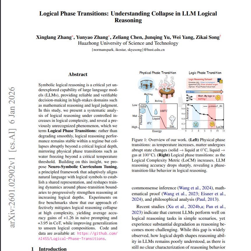 The paper shows LLM logic can suddenly collapse past a complexity threshold, and proposes training that reduces it. LLM logic does not fade slowly, it snaps at a threshold, and the authors show how to soften that snap