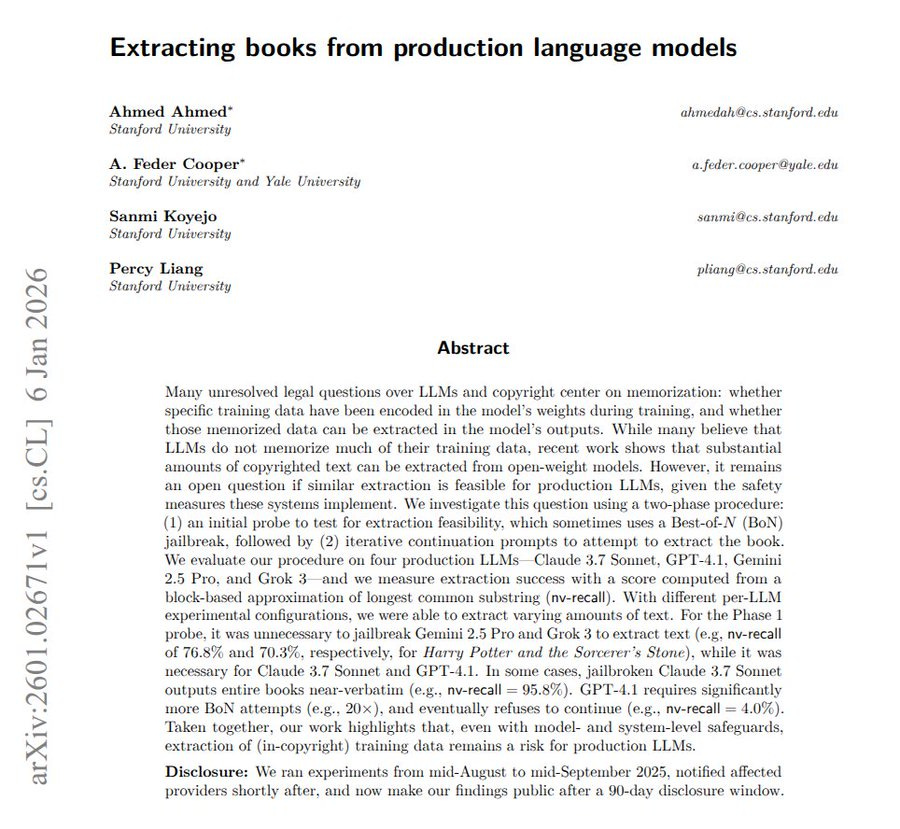 New Stanford paper shows production LLMs can leak near exact book text, with Claude 3.7 Sonnet hitting 95.8%. The big deal is that many companies and courts assume production LLMs are safe because they have filters, refusals, and safety layers that stop copying.