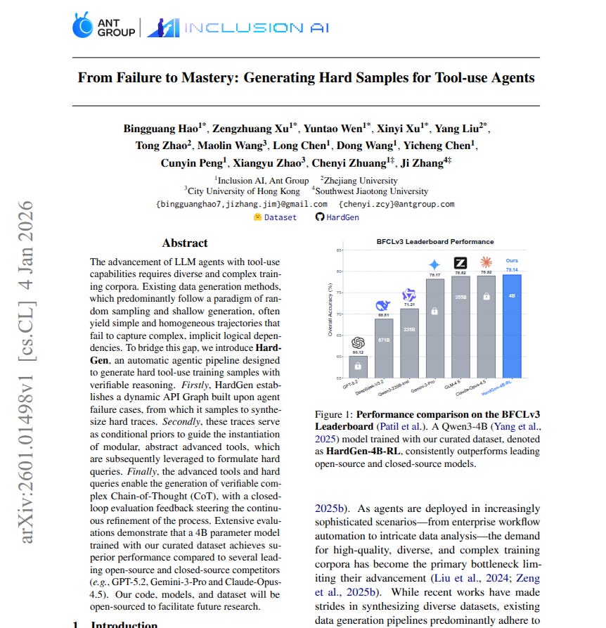 A hard query is written to match that description, and a reasoner plus verifier loop runs tools, spots mistakes, and gives hints to fix them. Using 2,095 APIs, they generated 27,000 verified conversations, trained Qwen3 4B, and got 79.14% on BFCLv3, a tough function calling test for tool commands. The result suggests agents improve faster when training targets real failure patterns, so small models can handle multi turn tool plans.