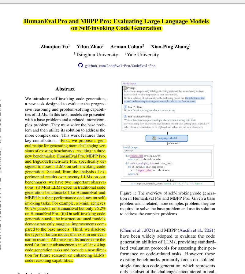 🗞️ "HumanEval Pro and MBPP Pro: Evaluating Large Language Models on Self-invoking Code Generation"