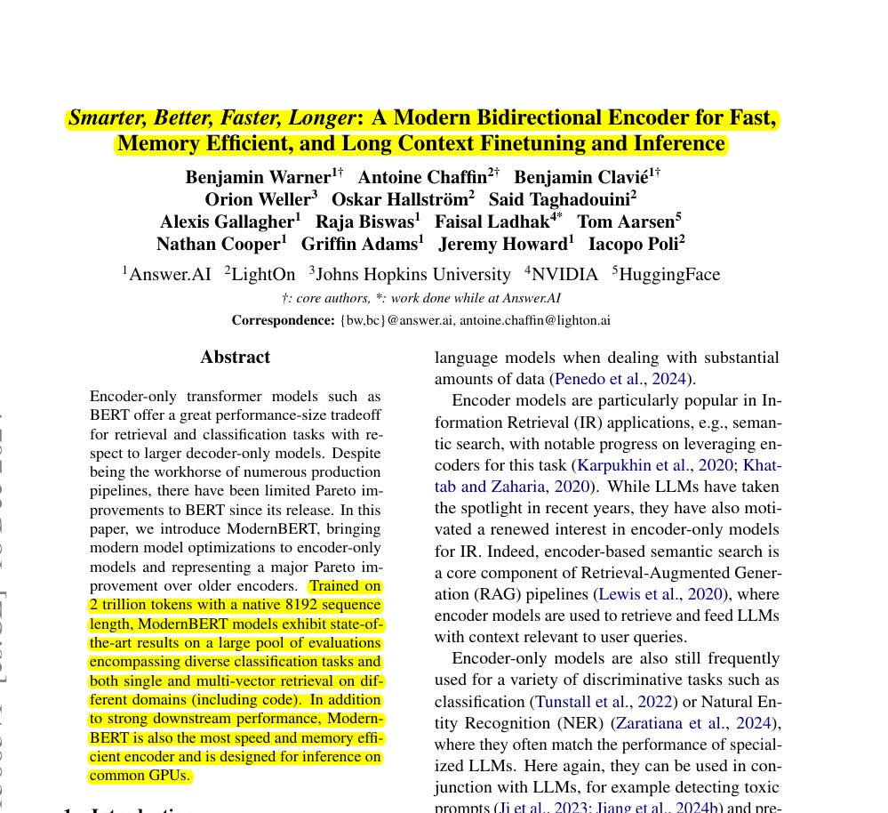 🗞️ "Smarter, Better, Faster, Longer: A Modern Bidirectional Encoder for Fast, Memory Efficient, and Long Context Finetuning and Inference"