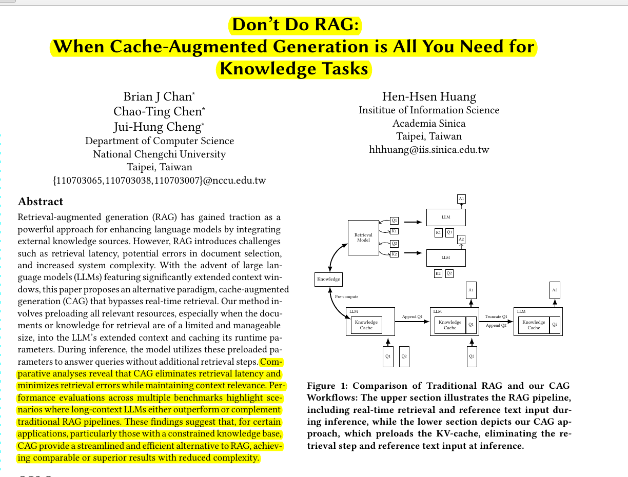 → The paper introduces Cache-Augmented Generation (CAG), which preloads all relevant documents into LLM's memory before inference.