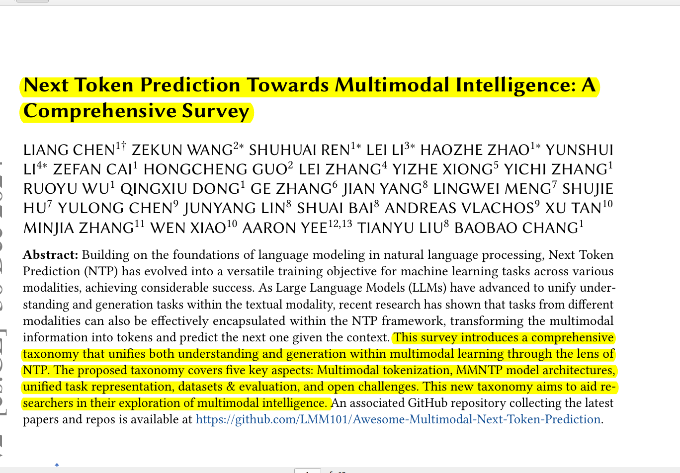 This paper introduces Next Token Prediction (NTP) as a unified framework for processing multiple types of data like images, audio, and text, transforming them into sequential tokens for AI models to understand and generate.
