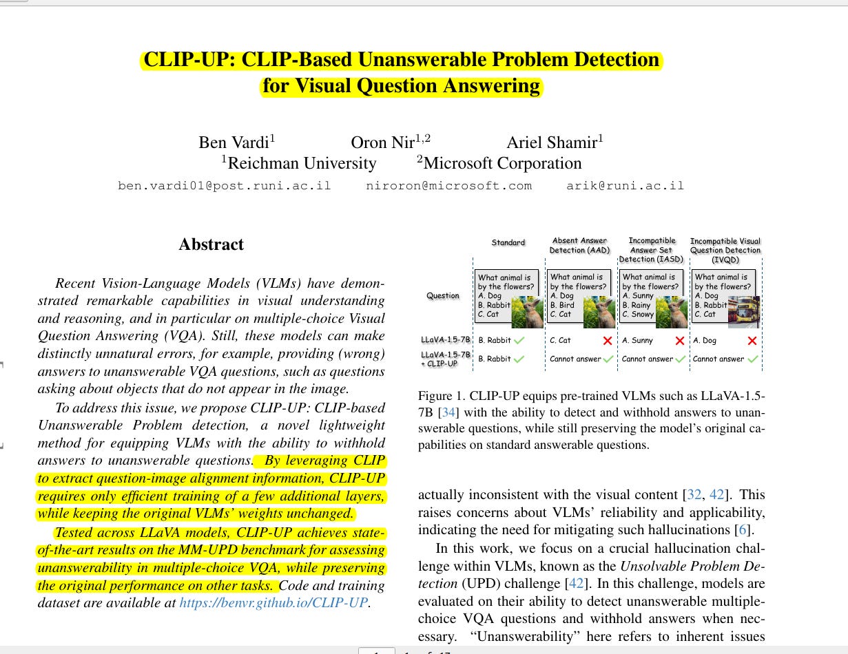 🗞️ "CLIP-UP: CLIP-Based Unanswerable Problem Detection for Visual Question Answering"