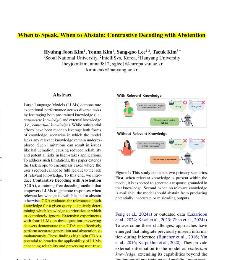 LLMs struggle with reliability when they lack knowledge, leading to hallucinations. This paper introduces Contrastive Decoding with Abstention (CDA), enabling models to either generate accurate responses or abstain when uncertain.