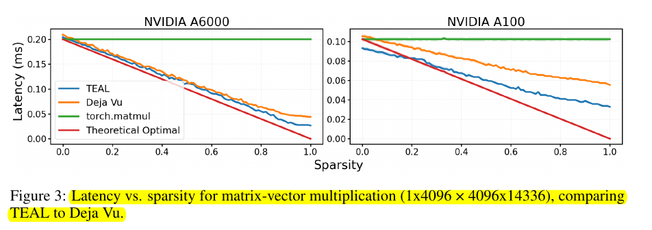 Latency vs. sparsity for matrix-vector multiplication (1x4096 × 4096x14336), comparing TEAL to Deja Vu.