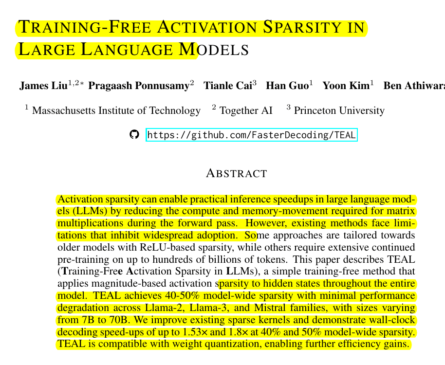 TEAL: Training-free Activation Sparsity in LLMs - Results are quite brilliant. 💡