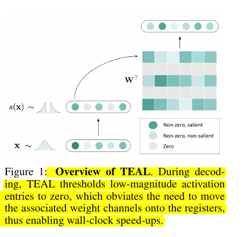 Efficient computation: By zeroing out low-magnitude activations, TEAL avoids the need to load and compute with the corresponding weight columns (shown as lighter columns in the matrix).