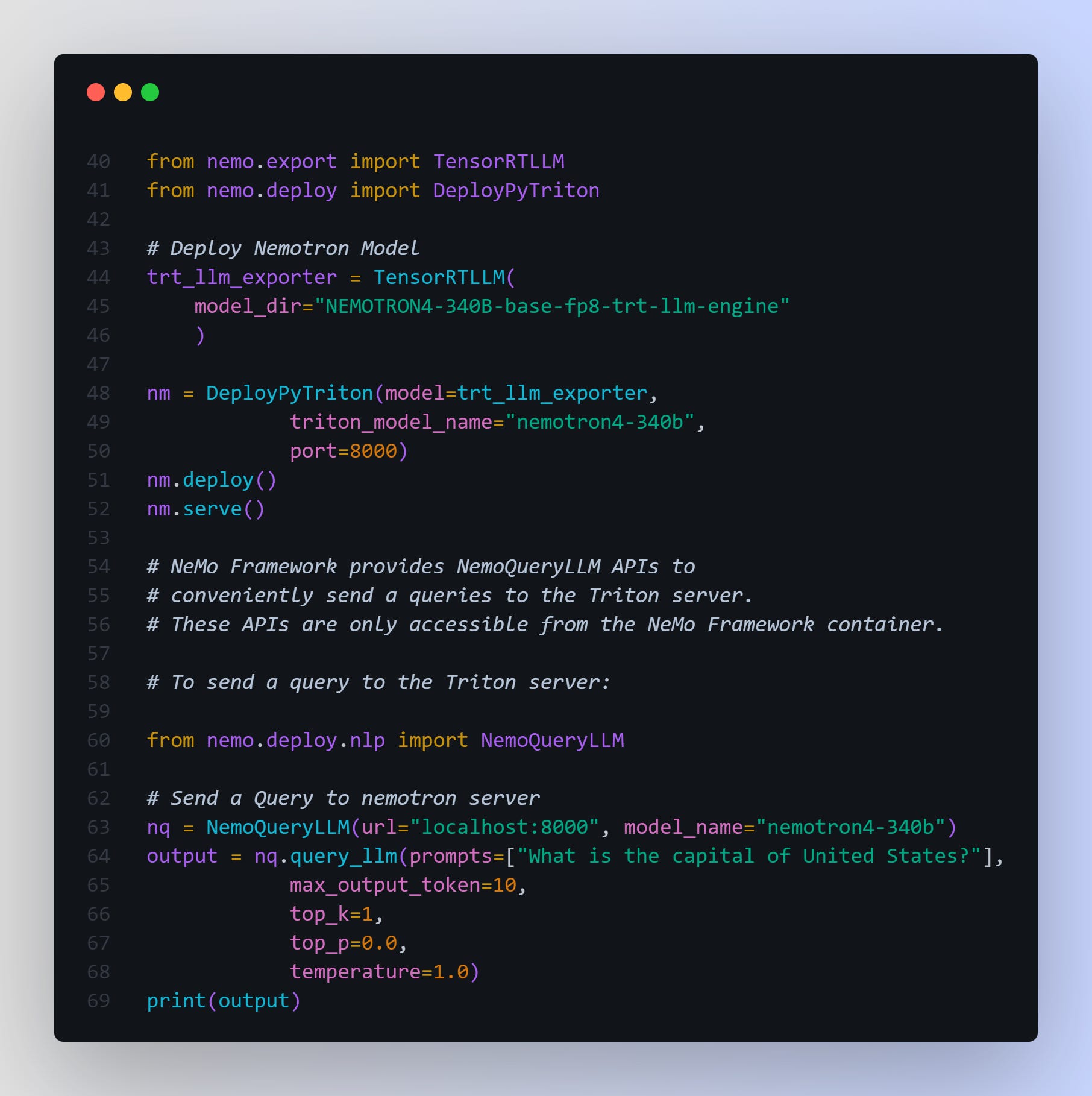 You can also run the below sample code, taken from NVIDIA's official guide, that deploys a Nemotron TensorRT-LLM model to Triton using the NeMo framework.