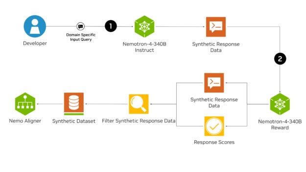 Synthetic Response Generation: A domain specific input query will be provided by the developer - at which point Nemotron-4 340B Instruct will be leveraged to generate ~150 questions. Then, Nemotron-4 340B Instruct will be used to generated 2 responses for each question.