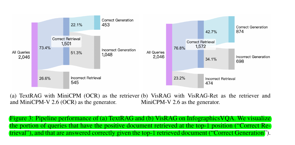 📊 VisRAG consistently outperforms text-based RAG systems in both retrieval and generation tasks.
