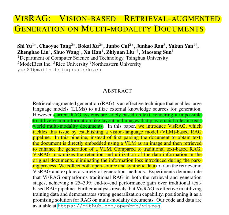 • VisRAG eliminates document parsing, preserving visual and layout information