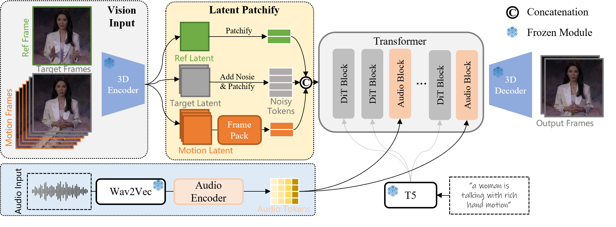Long clips are stabilized with compressed motion-frame tokens, which act like a memory of past moves so shots stay consistent without blowing up compute.