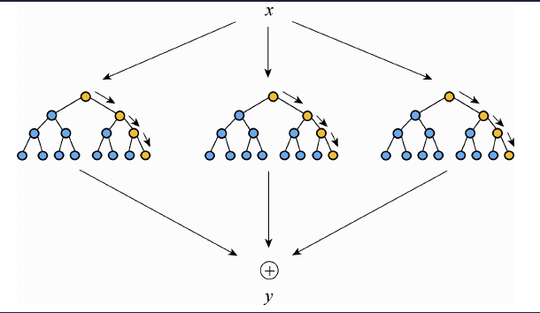 And so Bagging (bootstrap aggregating) can reduce the variance and improve the generalization error performance. The basic idea is to create B variants, X1, X2 , . . . , XB , of the training set X, using bootstrap techniques, by uniformly sampling from X with replacement. For each of the training set variants Xi , a tree Ti is constructed. The final decision for the classification of a given point is in favor of the class predicted by the majority of the subclassifiers Ti , i = 1, 2, . . . , B.