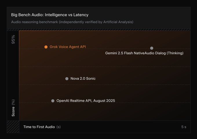 Grok Voice Agent now leads Artificial Analysis’s Big Bench Audio benchmark with 92.3% speech reasoning accuracy.