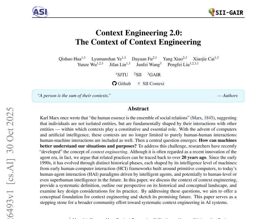 The paper explains how better context across 4 eras helps AI follow human intent. Context engineering is gathering, storing, organizing, and using that information so systems do the right thing.