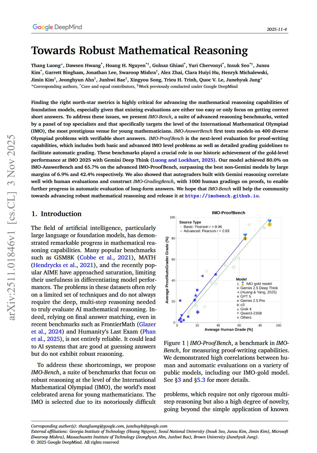 They present IMO-Bench, a full suite to test math reasoning at International Mathematical Olympiad level, not just final answers. It has 3 parts, IMO-AnswerBench for short answers, IMO-ProofBench for full proofs, and IMO-GradingBench for grading skill.